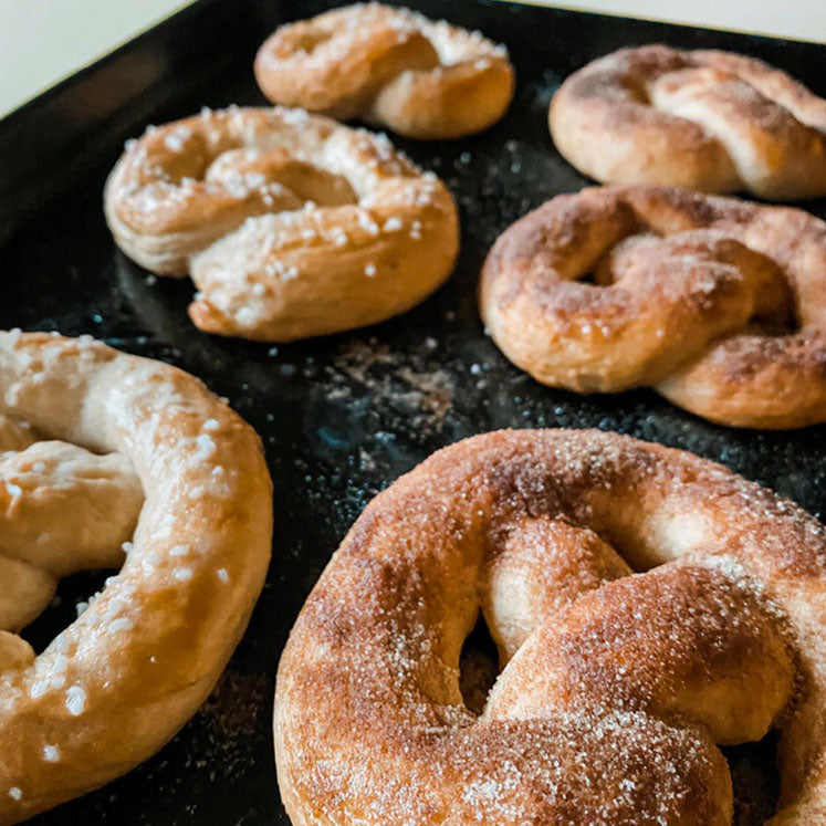 Our soft pretzels are Amish-Inspired, hand-rolled, artisanal, and baked in small batches. These recipes are free of preservatives, dairy, eggs, nuts, and soy beans.